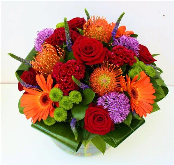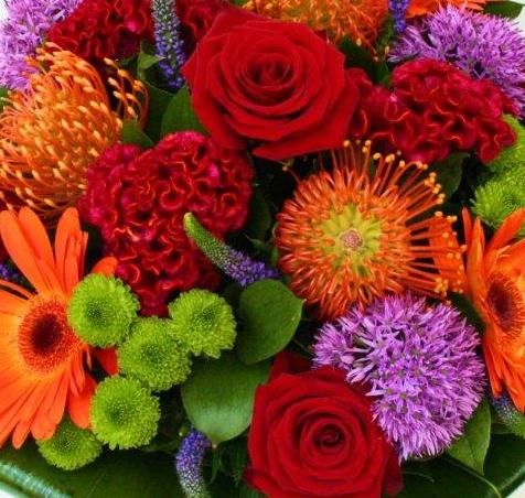 A rich and opulent hand-tied bouquet in reds, purples, oranges and lime including roses, proteas, alliums and gerberas.