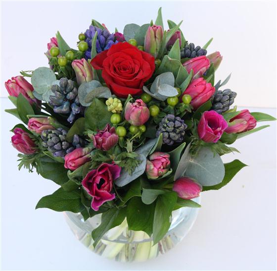 A gorgeous bouquet representing spring which includes a single red rose, hyacinths, anemonies and tulips.