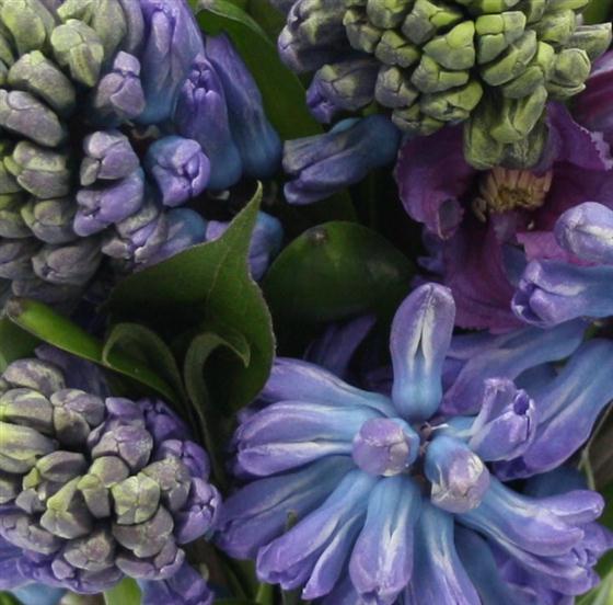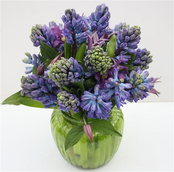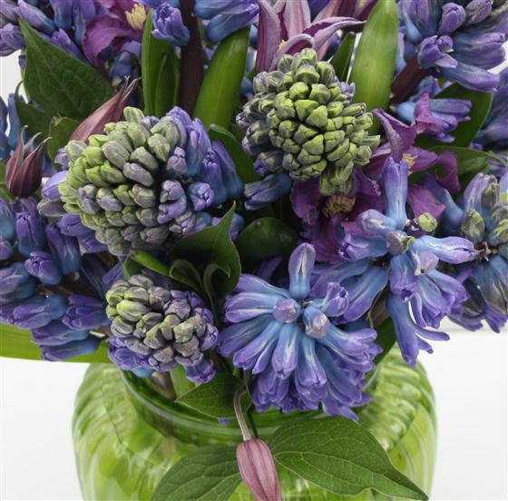 A green sweet vase that includes an abundance of blue hyacinths and blue clematis flower.