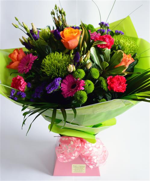 A show stopping display of warm colours with orange Roses, cerise Carnations,