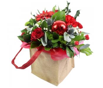 A unique Christmas gift bag, professionally arranged and delivered by a local florist. This beautiful baubled gift will include a festive range of florist fresh flowers. Including Santini, Holly, Eucalyptus Cinnerea and Ruskus. Flowers will be hand delivered by the local florist. Please note: The florist may substitute individual flowers at their discretion. The gift bag may vary from the one pictured.